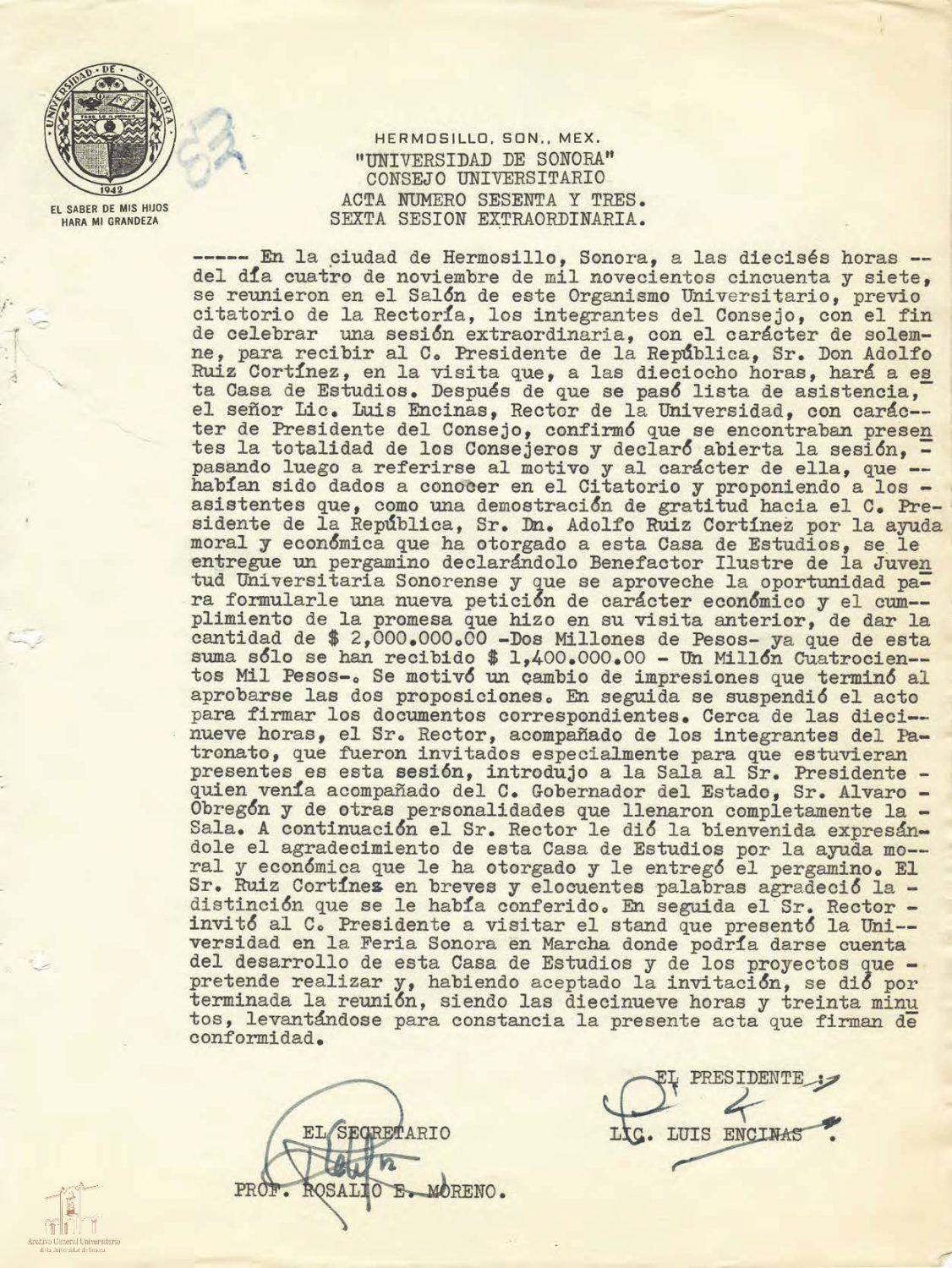 Documento del Mes de Noviembre Como Documento del Mes de noviembre, se presenta el acta número sesenta y seis, correspondiente a la sexta sesión extraordinaria del Consejo Universitario de la Universidad de Sonora, celebrada el cuatro de noviembre de 1957.